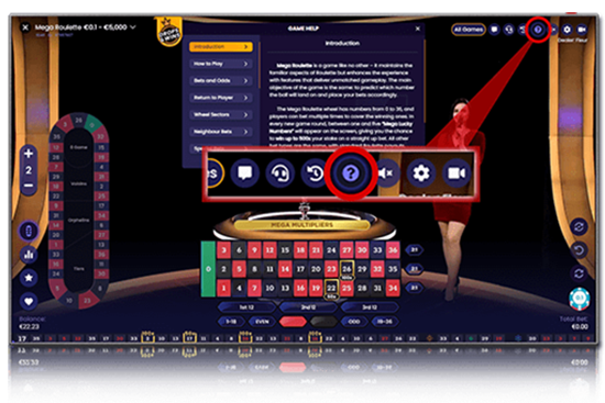 Para leer las Reglas del juego de cada juego, haga clic en el icono de ayuda mientras juega. Consulta las capturas de pantalla a continuación para ver dónde encontrar el ícono de ayuda según el proveedor de casino en vivo.